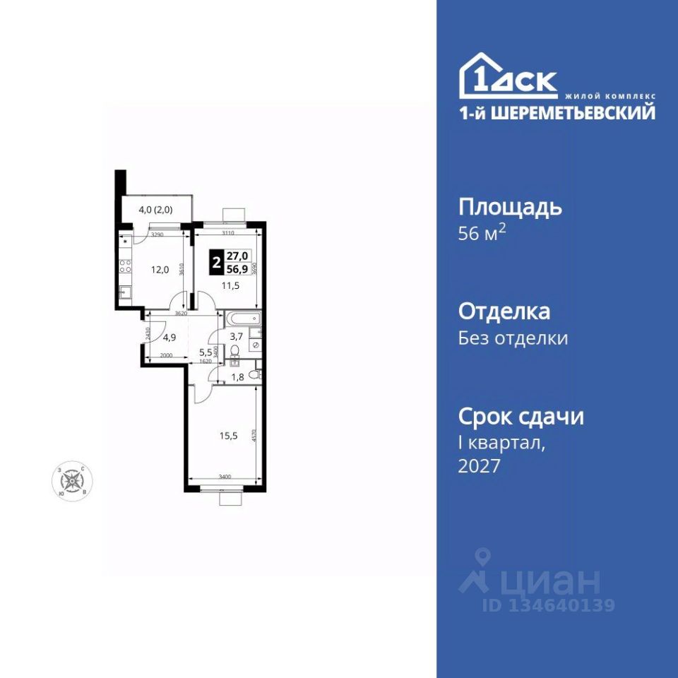 Продаётся 2-к квартира номер 1065 общей площадью 56.9 кв.м. на 9-м этаже 17 этажного дома. Без отделки.