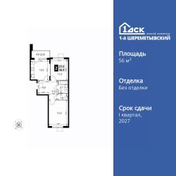 Продаётся 2-к квартира номер 1065 общей площадью 56.9 кв.м. на 9-м этаже 17 этажного здания. Без отделки.