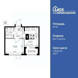 Продаётся 1-к квартира номер 1159 общей площадью 34 кв.м. на 14-м этаже 17 этажного здания. Без отделки.