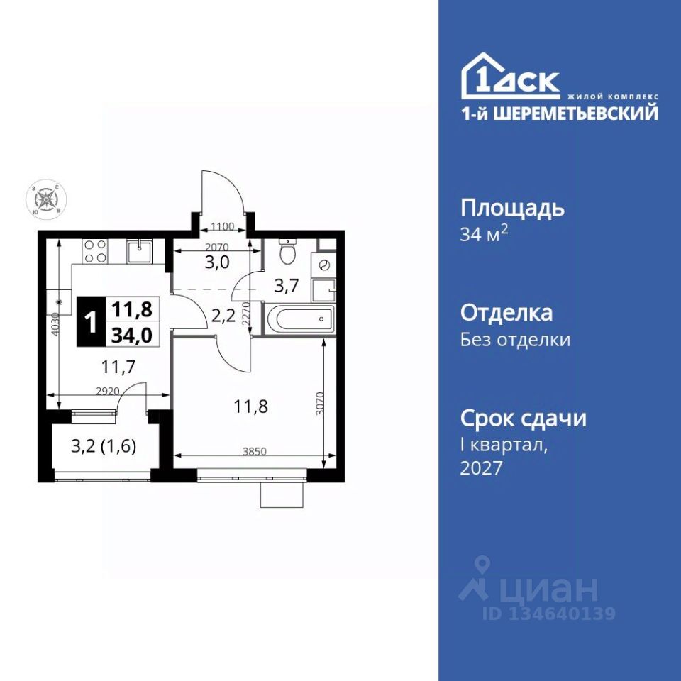 Продаётся 1-к квартира номер 1160 общей площадью 34 кв.м. на 14-м этаже 17 этажного здания. Без отделки.