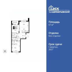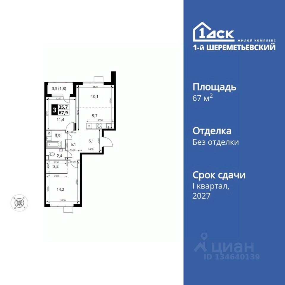 Продаётся 3-к квартира номер 1117 общей площадью 67.9 кв.м. на 3-м этаже 17 этажного дома. Без отделки.