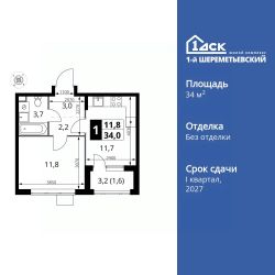 Продаётся 1-к квартира номер 1127 общей площадью 34 кв.м. на 6-м этаже 17 этажного здания. Без отделки.
