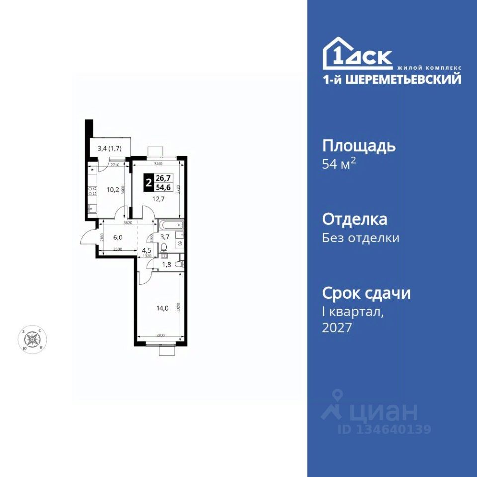 Продаётся 2-к квартира номер 1146 общей площадью 54.6 кв.м. на 11-м этаже 17 этажного дома. Без отделки.