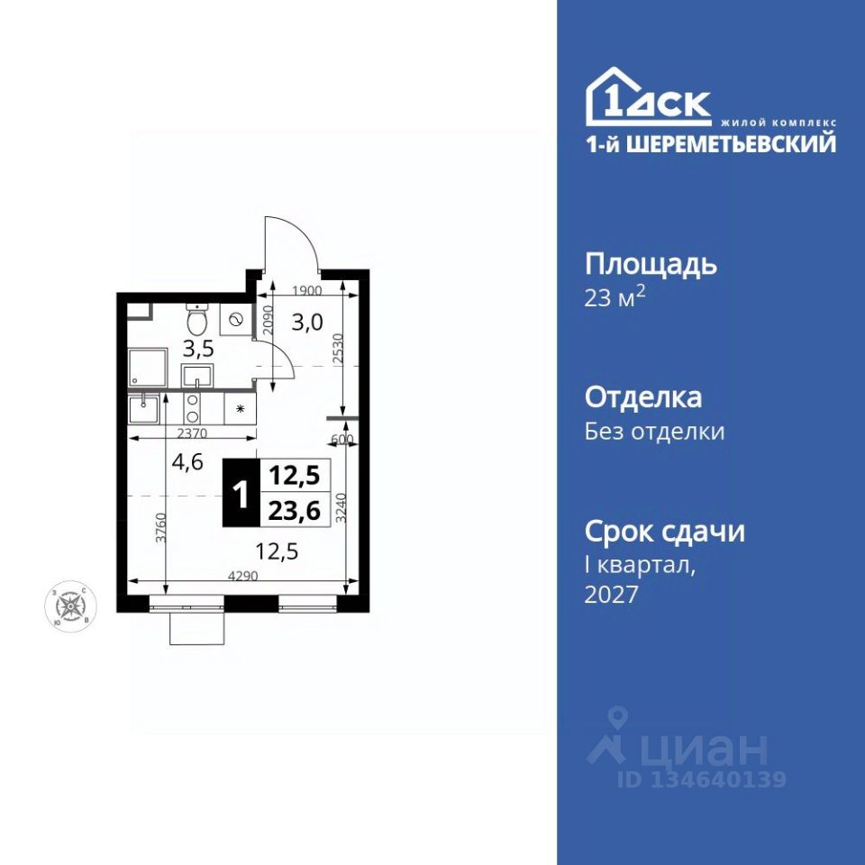 Продаётся квартира-студия номер 1214 общей площадью 23.6 кв.м. на 5-м этаже 17 этажного дома. Без отделки.