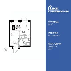 Продаётся квартира-студия номер 1328 общей площадью 23.8 кв.м. на 14-м этаже 17 этажного здания. Без отделки.