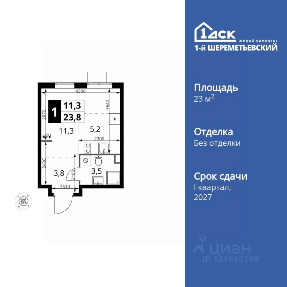 Продаётся квартира-студия номер 1340 общей площадью 23.8 кв.м. на 15-м этаже 17 этажного здания. Без отделки.