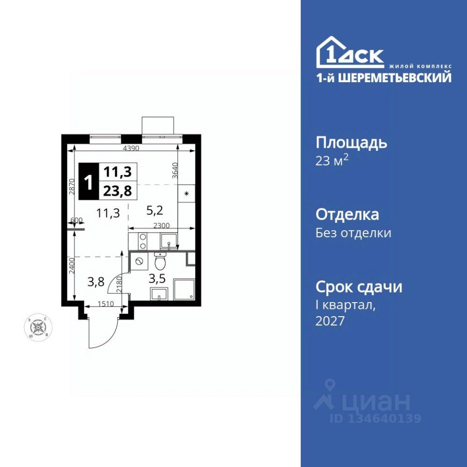Продаётся квартира-студия номер 1352 общей площадью 23.8 кв.м. на 16-м этаже 17 этажного здания. Без отделки.