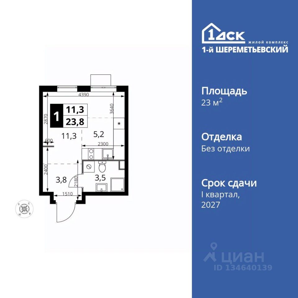 Продаётся квартира-студия номер 1364 общей площадью 23.8 кв.м. на 17-м этаже 17 этажного здания. Без отделки.