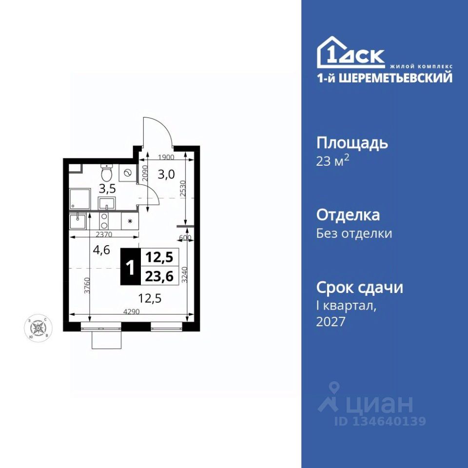 Продаётся квартира-студия номер 1178 общей площадью 23.6 кв.м. на 2-м этаже 17 этажного здания. Без отделки.