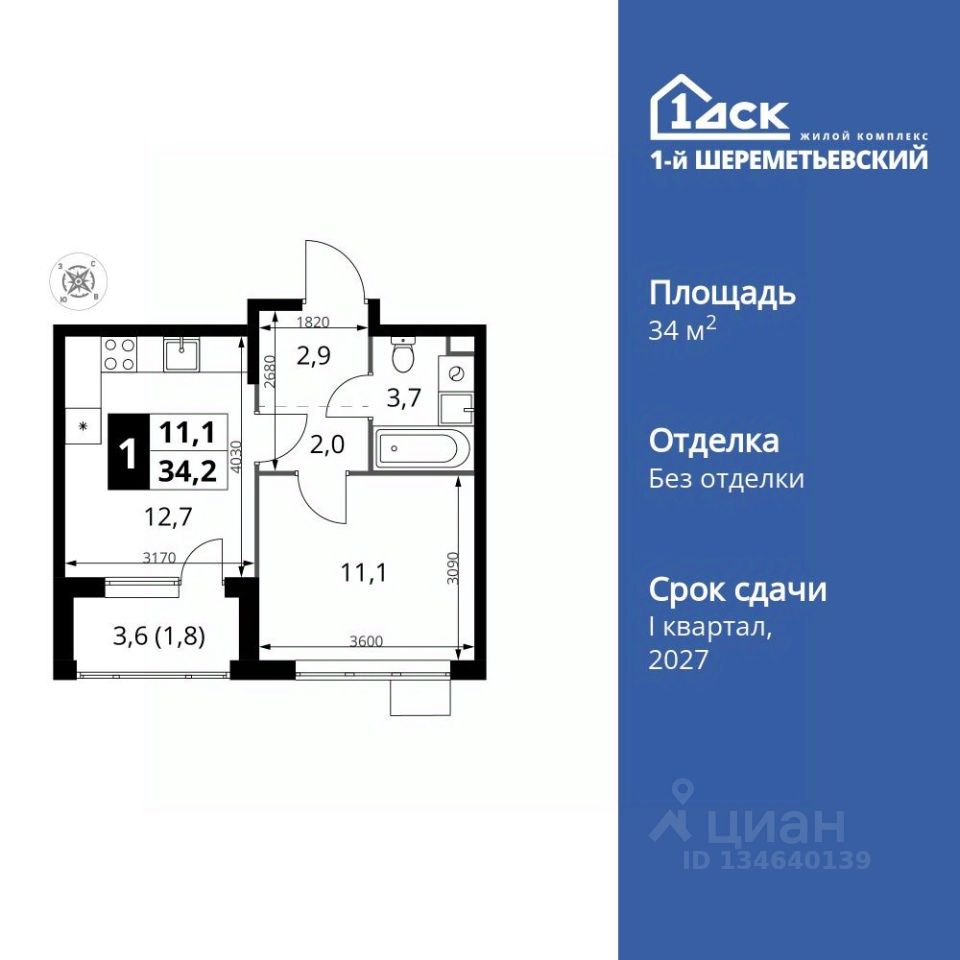 Продаётся 1-к квартира номер 1236 общей площадью 34.2 кв.м. на 7-м этаже 17 этажного дома. Без отделки.