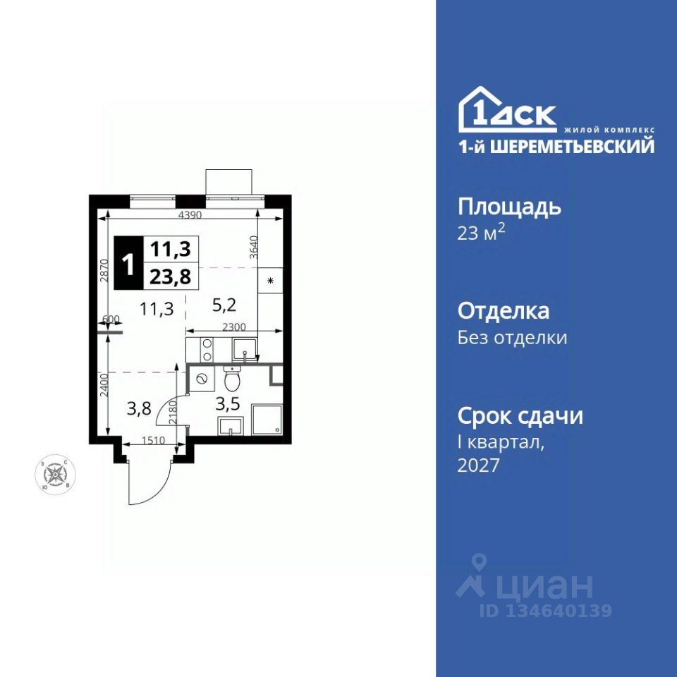 Продаётся квартира-студия номер 1244 общей площадью 23.8 кв.м. на 7-м этаже 17 этажного здания. Без отделки.