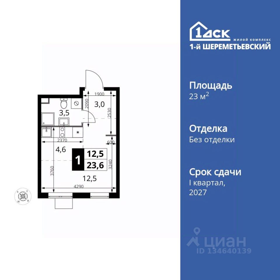 Продаётся квартира-студия номер 1262 общей площадью 23.6 кв.м. на 9-м этаже 17 этажного дома. Без отделки.