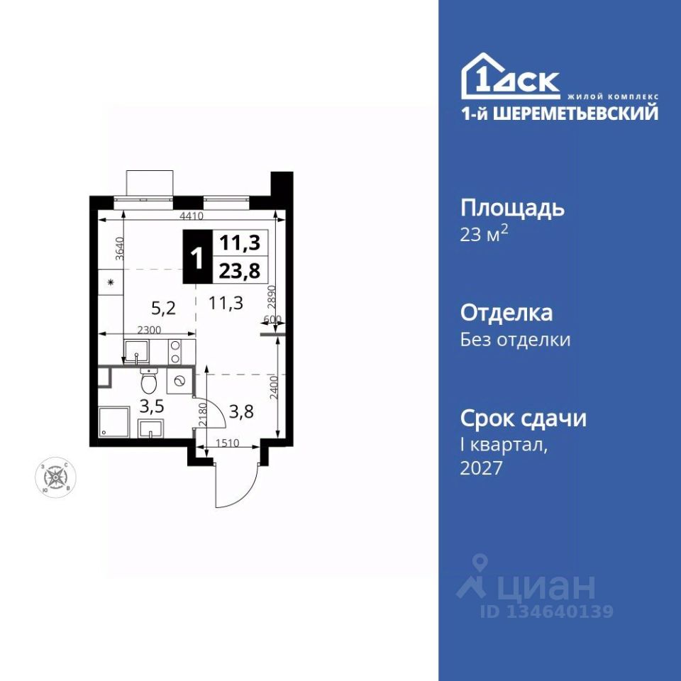 Продаётся квартира-студия номер 1269 общей площадью 23.8 кв.м. на 9-м этаже 17 этажного здания. Без отделки.