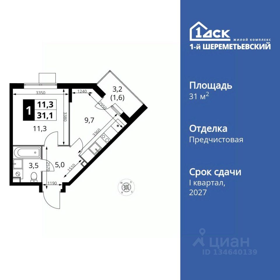 Продаётся 1-к квартира номер 128 общей площадью 31.1 кв.м. на 9-м этаже 16 этажного дома. Отделка Whitebox.