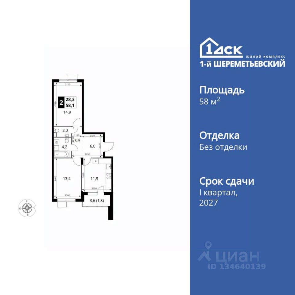 Продаётся 2-к квартира номер 182 общей площадью 58.1 кв.м. на 6-м этаже 16 этажного здания. Без отделки.