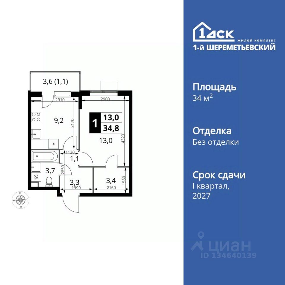 Продаётся 1-к квартира номер 325 общей площадью 34.8 кв.м. на 14-м этаже 17 этажного дома. Без отделки.
