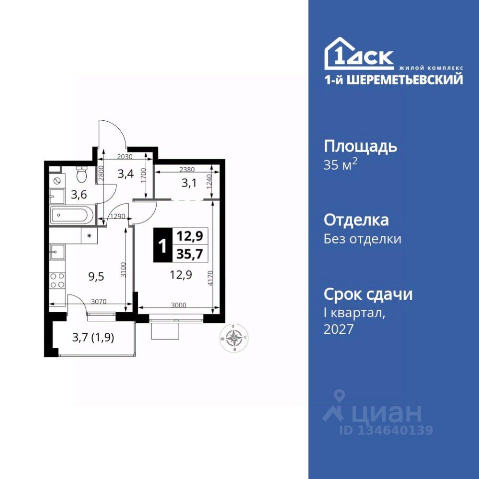 Продаётся 1-к квартира номер 329 общей площадью 35.7 кв.м. на 14-м этаже 17 этажного здания. Без отделки.