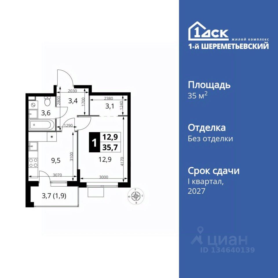 Продаётся 1-к квартира номер 337 общей площадью 35.7 кв.м. на 15-м этаже 17 этажного здания. Без отделки.