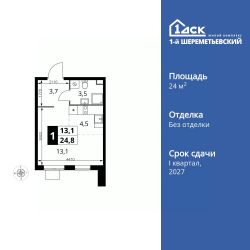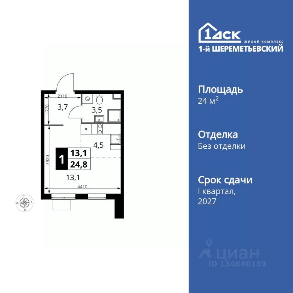 Продаётся квартира-студия номер 234 общей площадью 24.8 кв.м. на 3-м этаже 17 этажного здания. Без отделки.