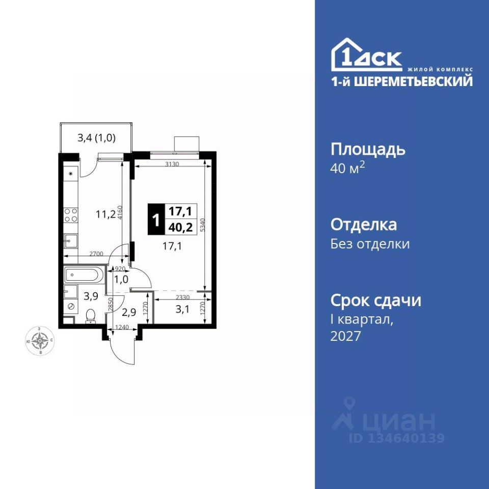 Продаётся 1-к квартира номер 384 общей площадью 40.2 кв.м. на 5-м этаже 17 этажного здания. Без отделки.