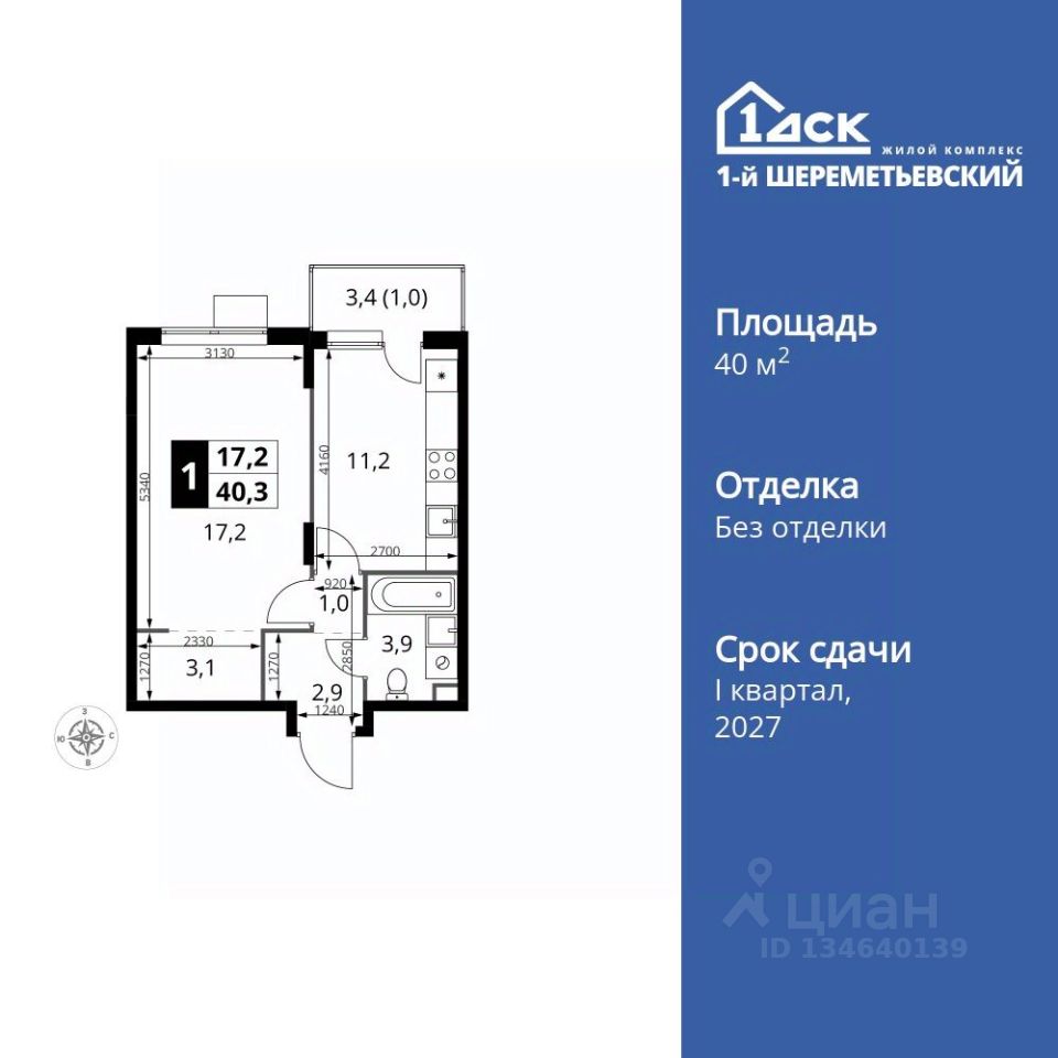 Продаётся 1-к квартира номер 479 общей площадью 40.3 кв.м. на 17-м этаже 17 этажного дома. Без отделки.