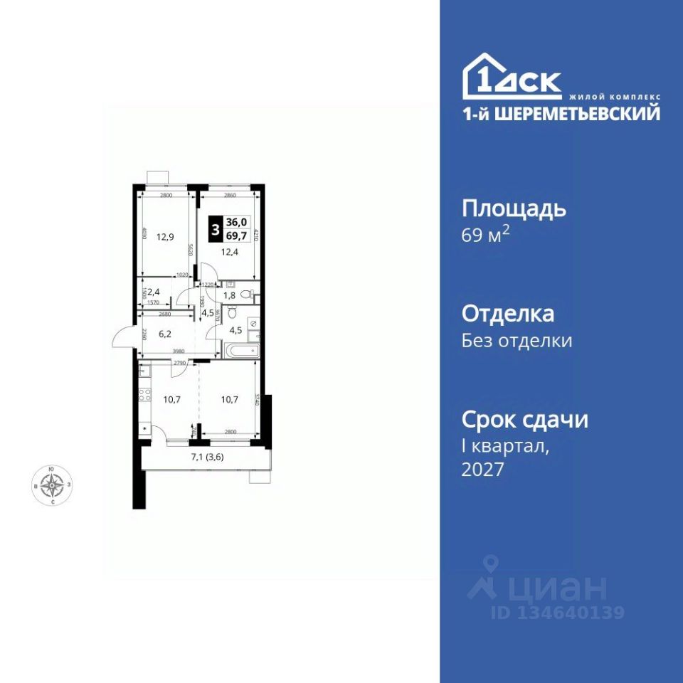 Продаётся 3-к квартира номер 529 общей площадью 69.7 кв.м. на 13-м этаже 17 этажного дома. Без отделки.