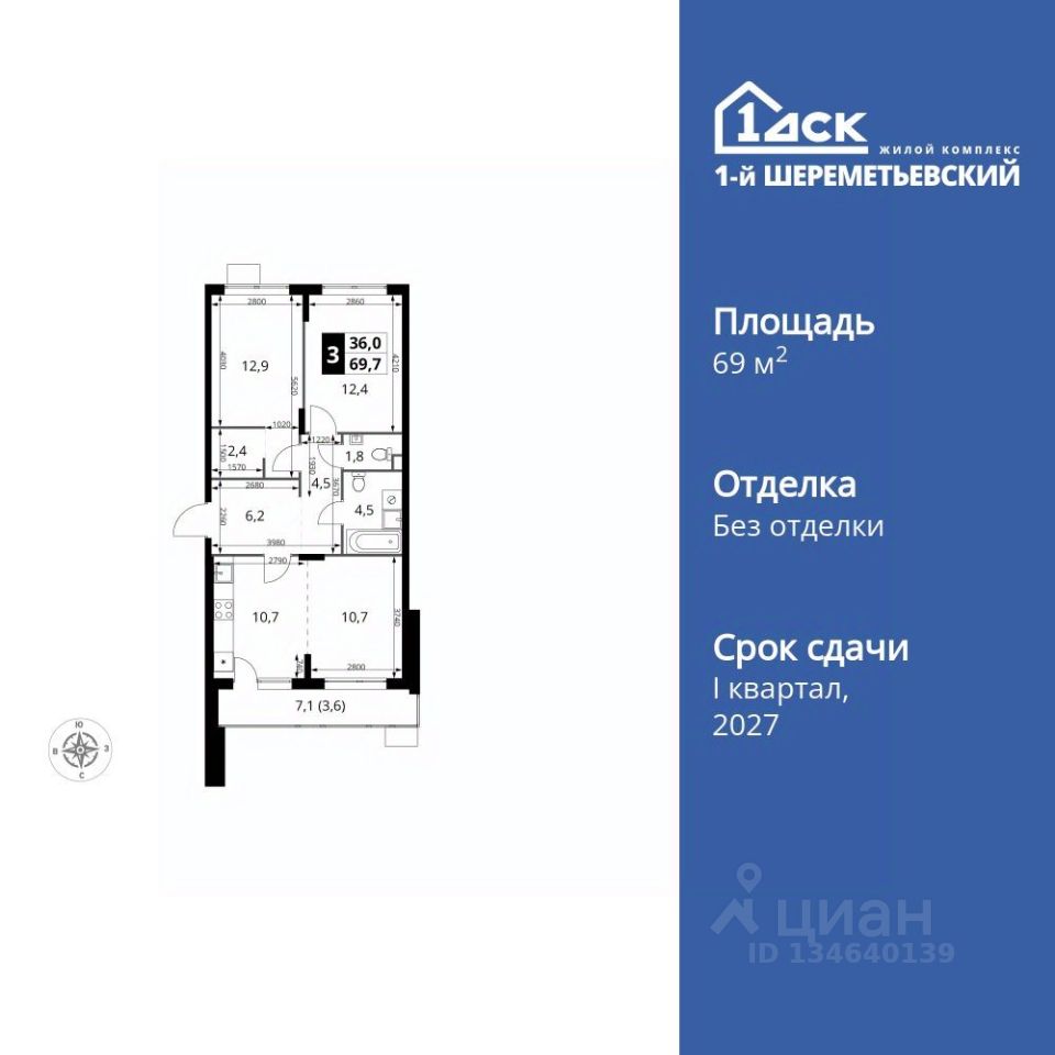 Продаётся 3-к квартира номер 545 общей площадью 69.7 кв.м. на 17-м этаже 17 этажного дома. Без отделки.