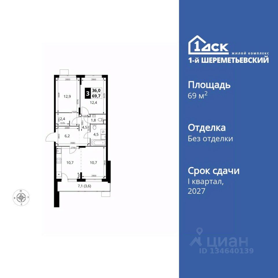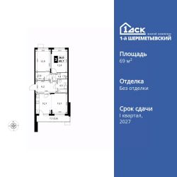 Продаётся 3-к квартира номер 545 общей площадью 69.7 кв.м. на 17-м этаже 17 этажного здания. Без отделки.