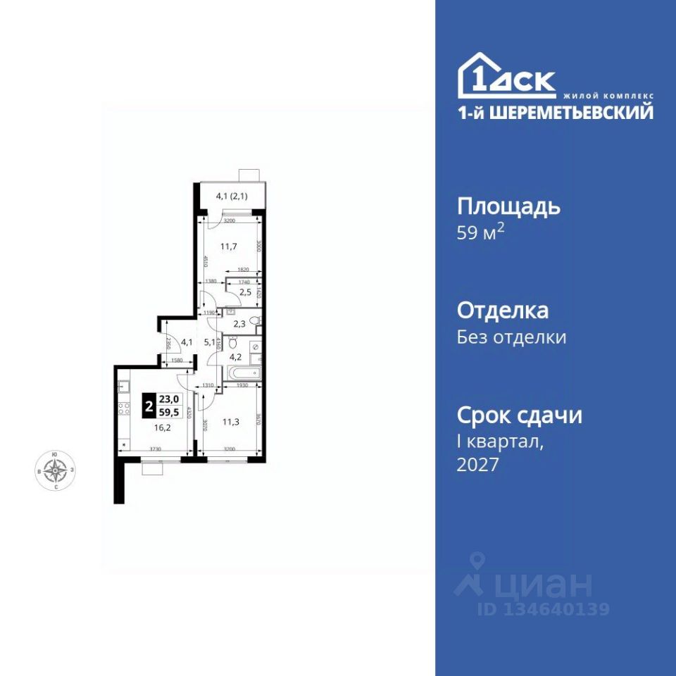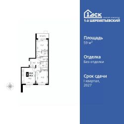 Продаётся 2-к квартира номер 665 общей площадью 59.5 кв.м. на 11-м этаже 17 этажного дома. Без отделки.