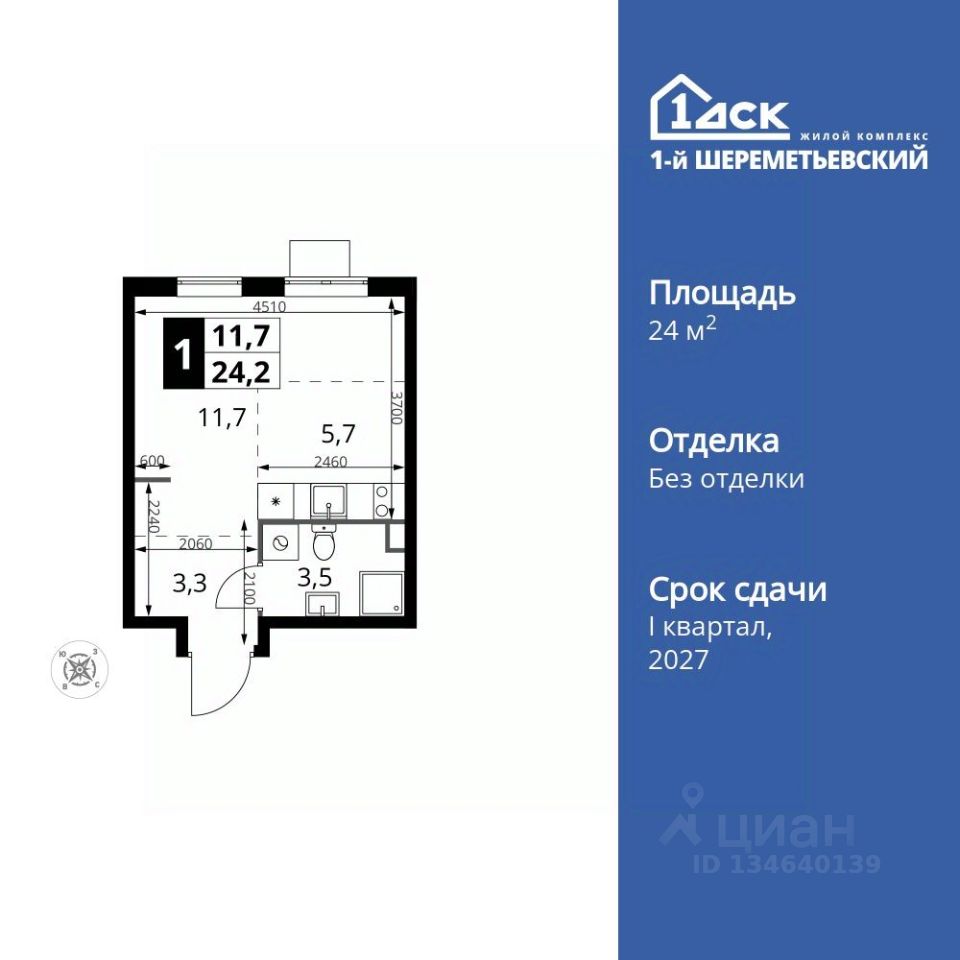 Продаётся квартира-студия номер 701 общей площадью 24.2 кв.м. на 4-м этаже 17 этажного здания. Без отделки.