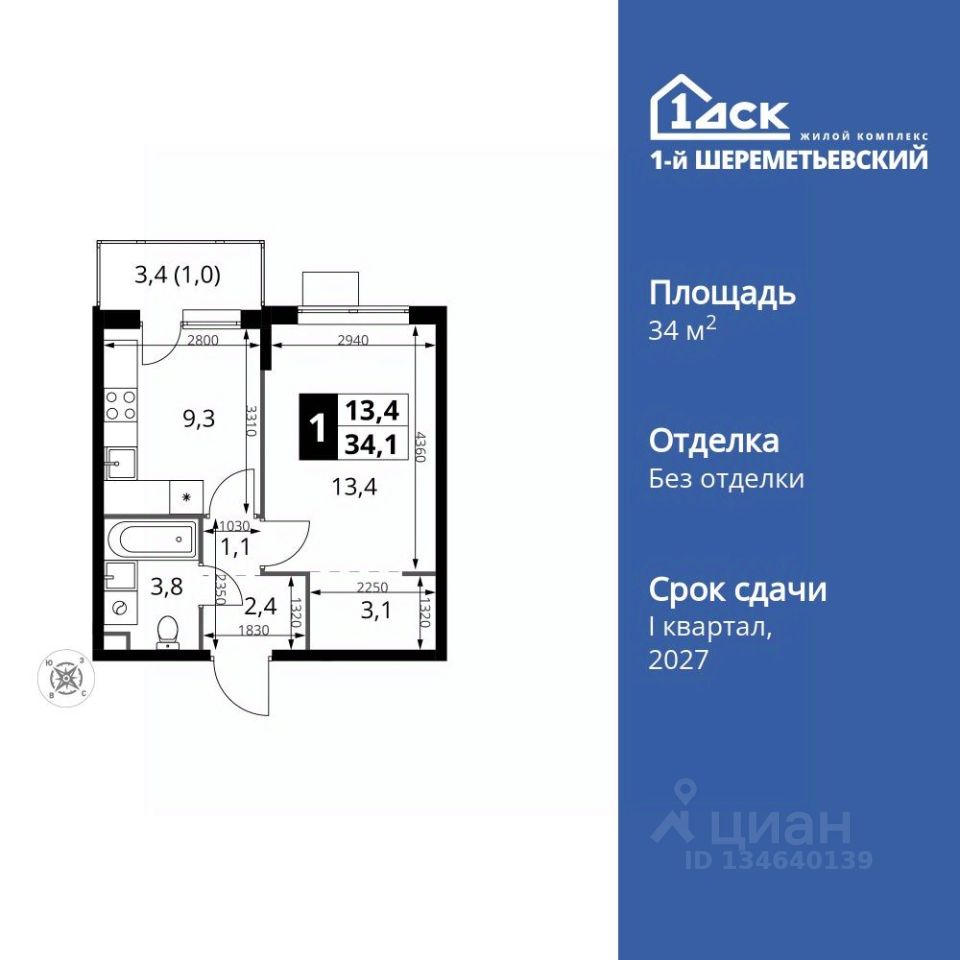 Продаётся 1-к квартира номер 722 общей площадью 34.1 кв.м. на 8-м этаже 17 этажного здания. Без отделки.