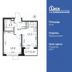 Продаётся 1-к квартира номер 205 общей площадью 33.8 кв.м. на 16-м этаже 17 этажного здания. Отделка Whitebox.