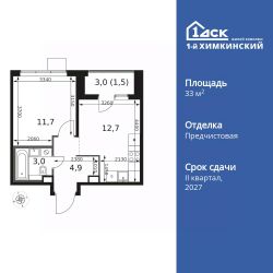Продаётся 1-к квартира номер 210 общей площадью 33.8 кв.м. на 16-м этаже 17 этажного здания. Отделка Whitebox.