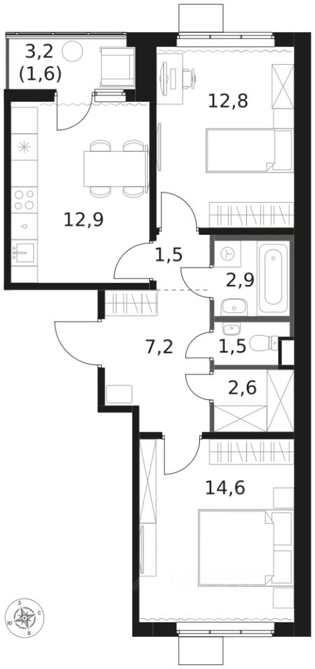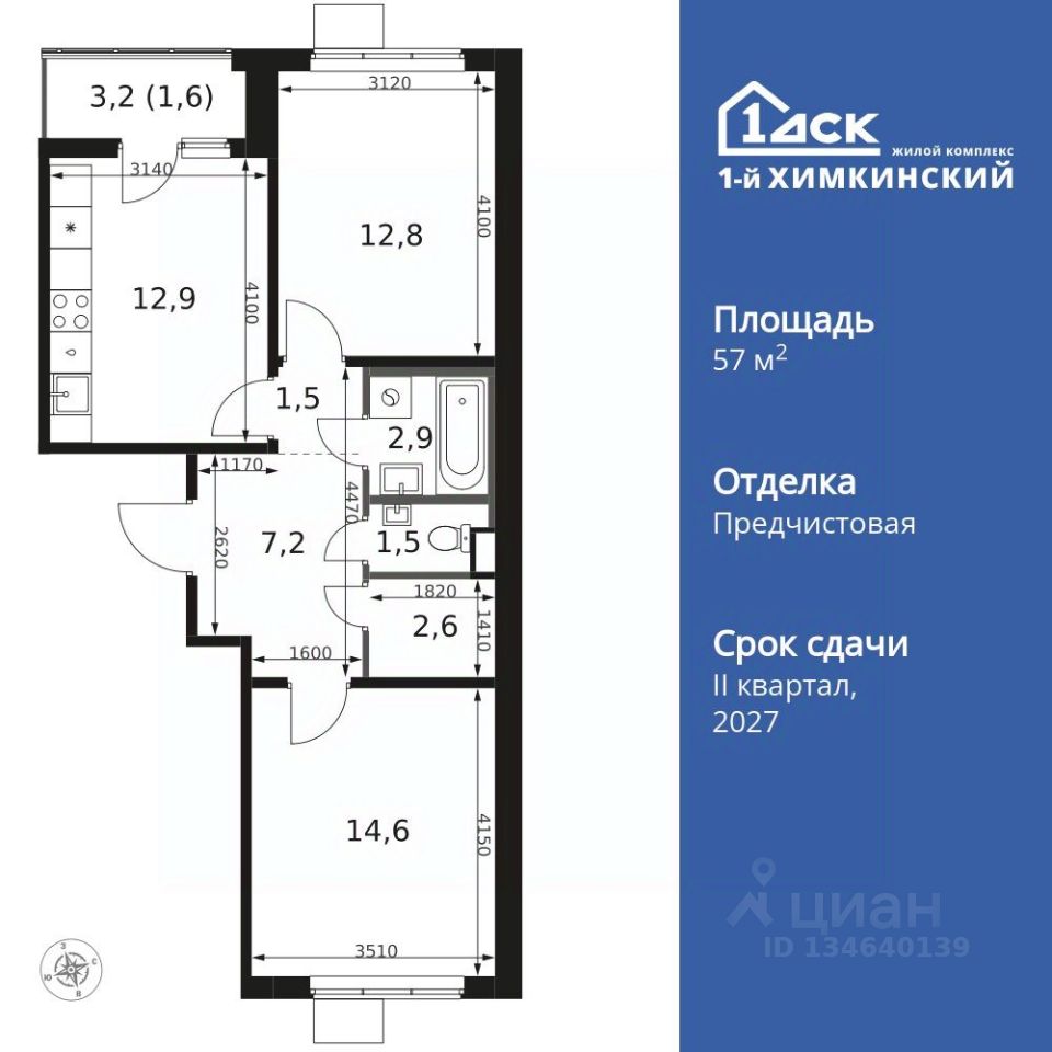 Продаётся 2-к квартира номер 517 общей площадью 57.6 кв.м. на 13-м этаже 14 этажного здания. Отделка Whitebox.