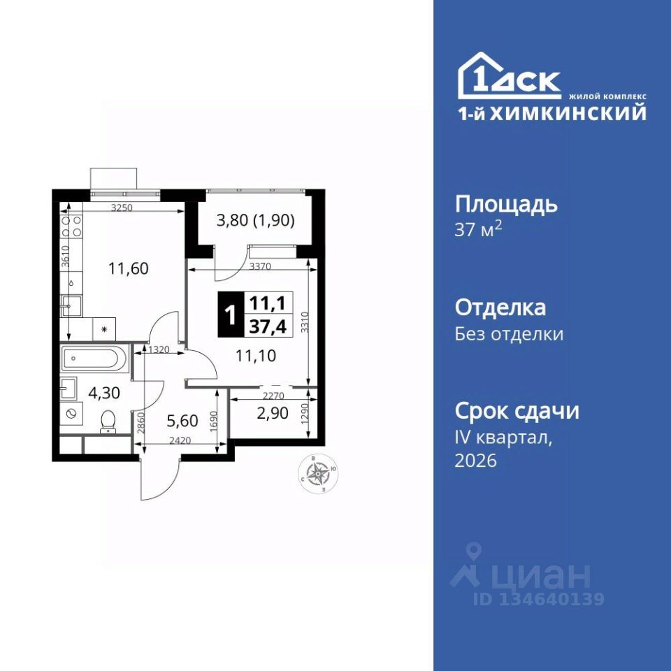 Продаётся 1-к квартира номер 272 общей площадью 37.4 кв.м. на 13-м этаже 16 этажного дома. Без отделки.