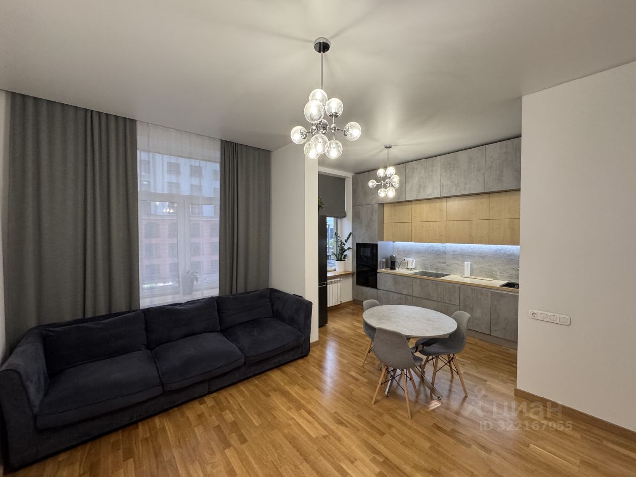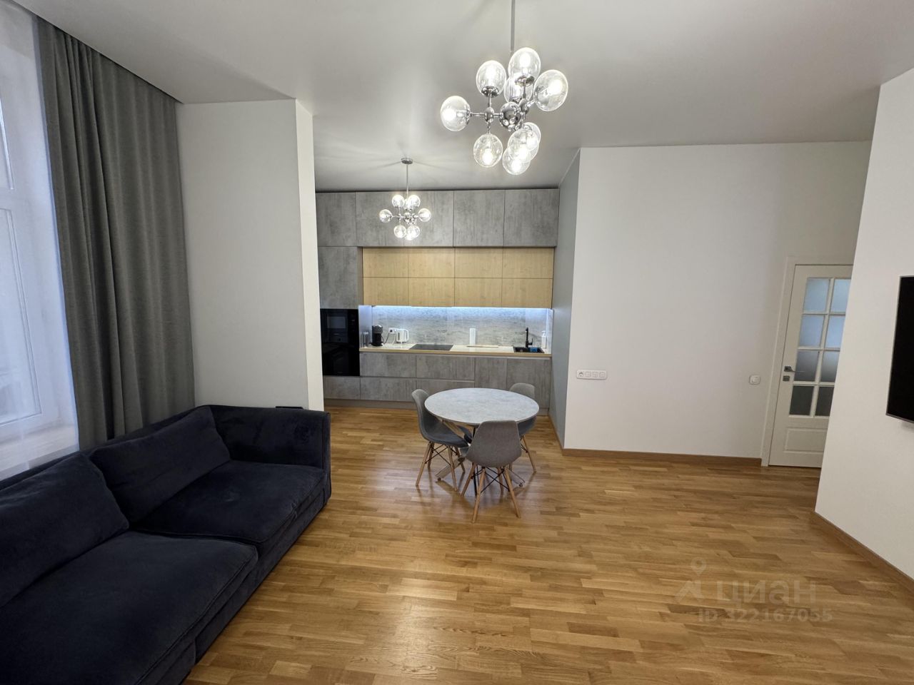 На полу застелен паркет, стены белые, квартира наполнена воздухом и свободой, за счет высоких потолков 3,20м. Оконный проем 2,20м, с широкими подоконниками.