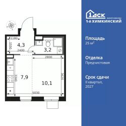 Продаётся квартира-студия номер 105 общей площадью 25.5 кв.м. на 9-м этаже 17 этажного здания. Отделка Whitebox.