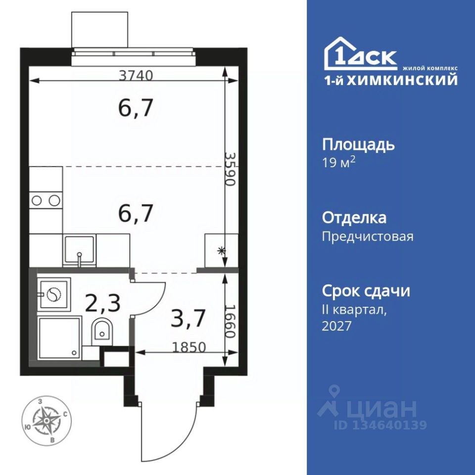 Продаётся квартира-студия номер 557 общей площадью 19.4 кв.м. на 5-м этаже 17 этажного здания. Отделка Whitebox.