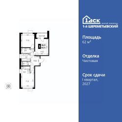 Продаётся 3-к квартира номер 1039 общей площадью 62.5 кв.м. на 2-м этаже 16 этажного здания. Чистовая отделка. Цена с учётом скидки.