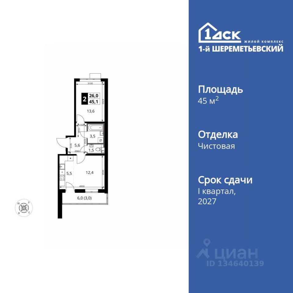 Продаётся 2-к квартира номер 740 общей площадью 45.1 кв.м. на 8-м этаже 16 этажного здания. Чистовая отделка. Цена с учётом скидки.