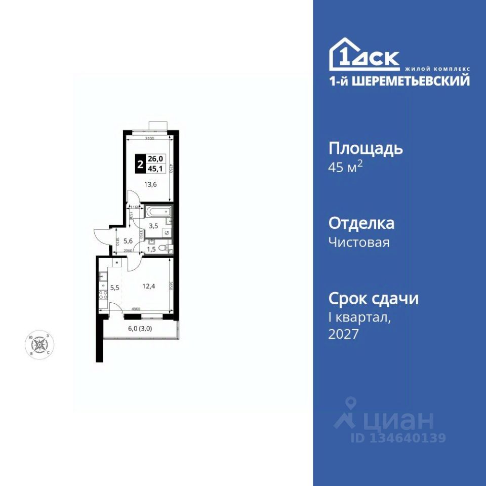 Продаётся 2-к квартира номер 750 общей площадью 45.1 кв.м. на 10-м этаже 16 этажного здания. Чистовая отделка. Цена с учётом скидки.