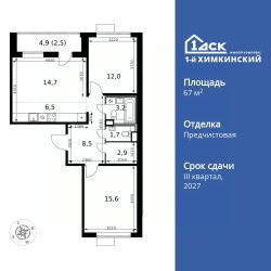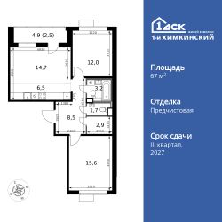 Продаётся 3-к квартира номер 245 общей площадью 67.6 кв.м. на 7-м этаже 9 этажного здания. Отделка Whitebox. Цена с учётом скидки.