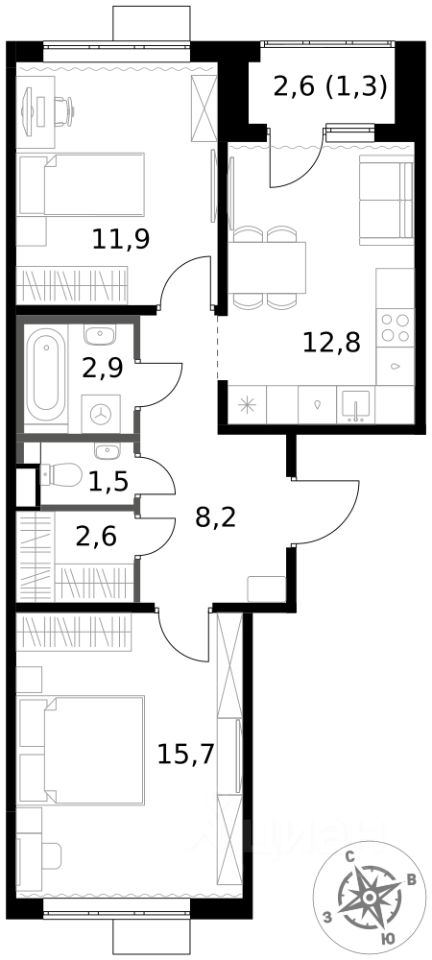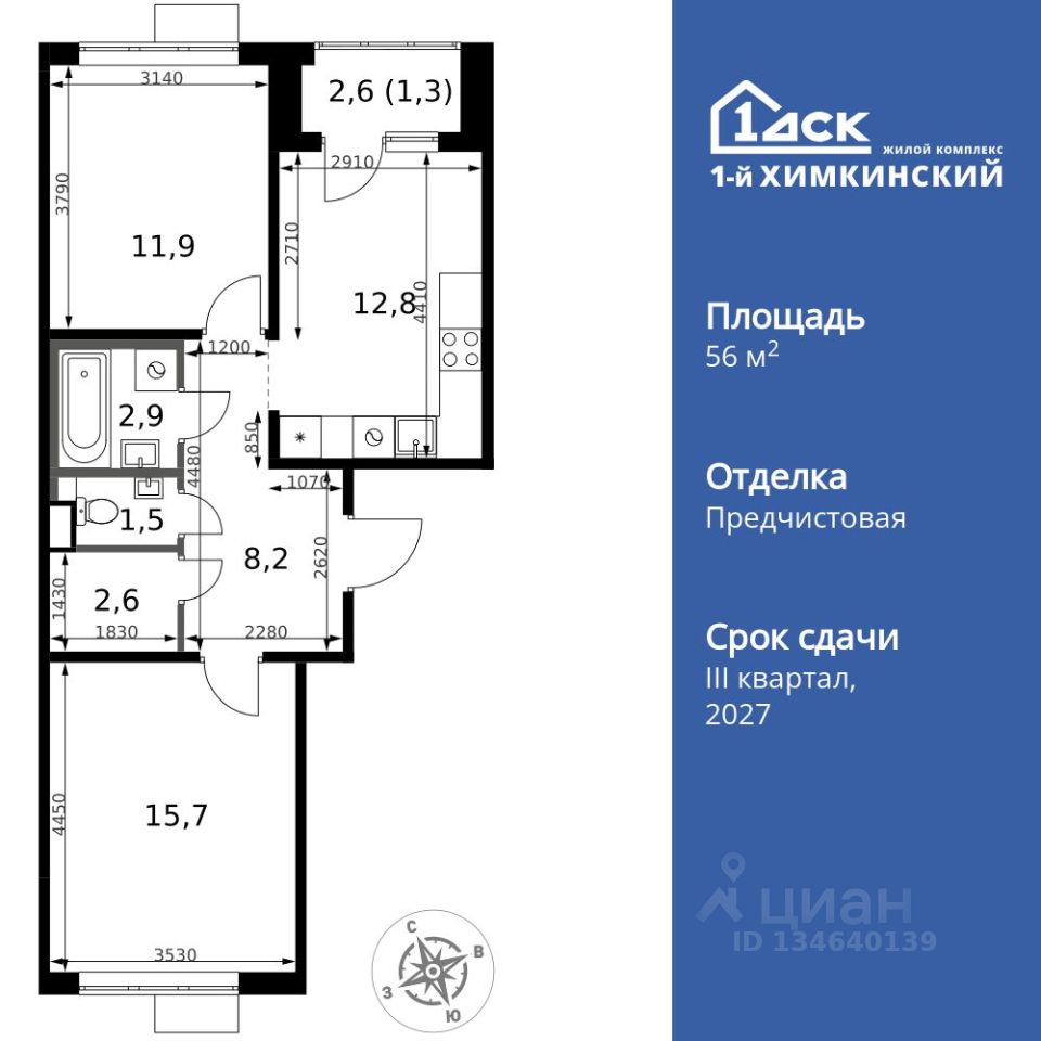 Продаётся 2-к квартира номер 244 общей площадью 56.9 кв.м. на 6-м этаже 9 этажного здания. Отделка Whitebox. Цена с учётом скидки.