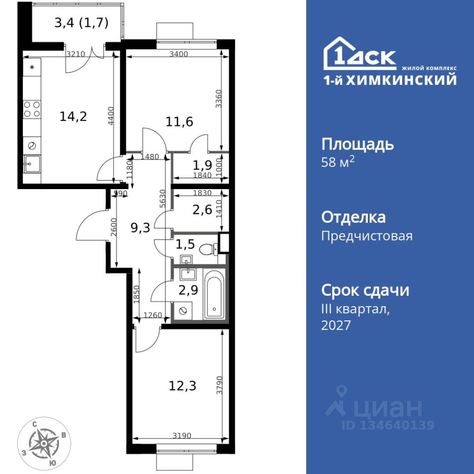 Продаётся 2-к квартира номер 519 общей площадью 58 кв.м. на 3-м этаже 13 этажного здания. Отделка Whitebox. Цена с учётом скидки.
