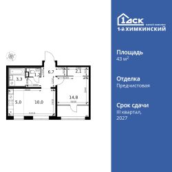 Продаётся 2-к квартира номер 565 общей площадью 43.1 кв.м. на 2-м этаже 16 этажного здания. Отделка Whitebox. Цена с учётом скидки.