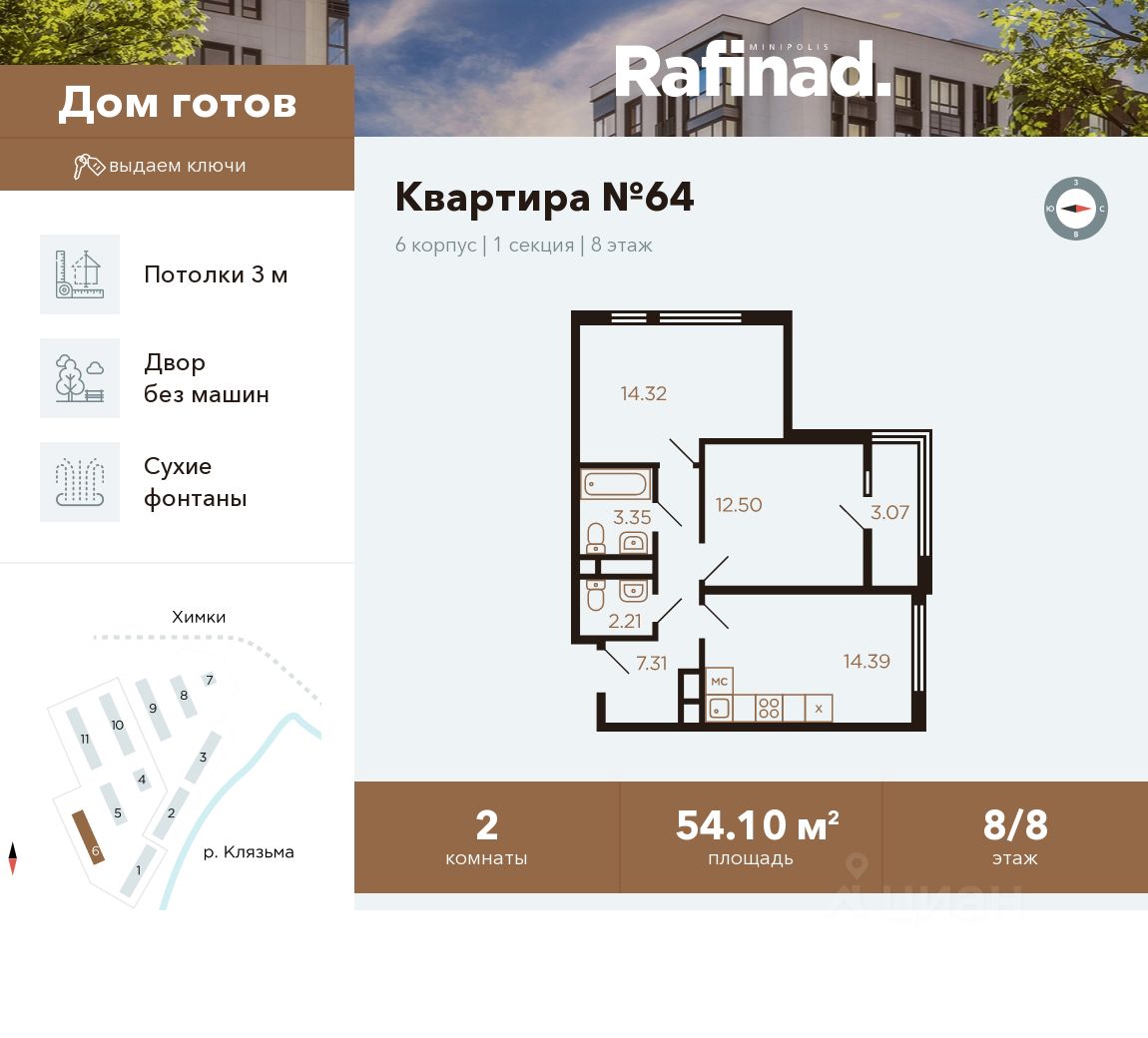Продаётся 2-комнатная квартира общей площадью 54.10 м² на 8 этаже.