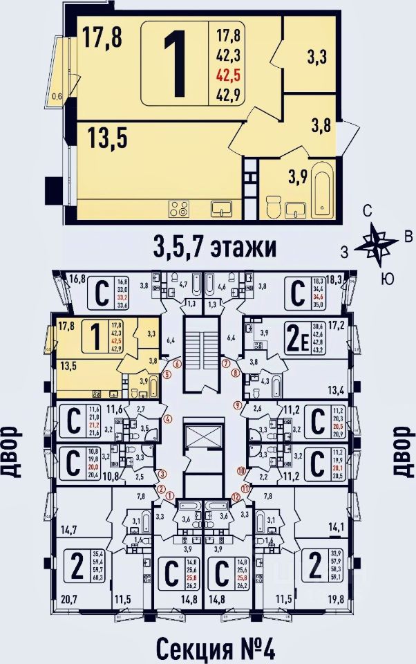 Предлагается однокомнатная квартира 42,5 кв.м. с классической планировкой с одной спальней 17,8 кв.м и кухней 13,5 кв.м. Предусмотрено место для гардеробной 3,3 кв.м.