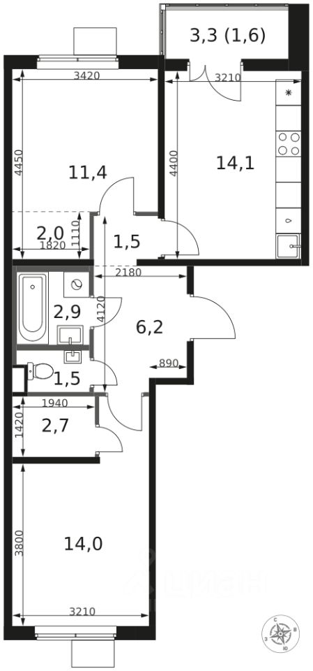 Продаётся 2-к квартира номер 681 общей площадью 57.9 кв.м. на 4-м этаже 8 этажного здания. Отделка Whitebox.
