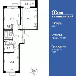 Продаётся 2-к квартира номер 562 общей площадью 58.5 кв.м. на 13-м этаже 13 этажного здания. Отделка Whitebox. Цена с учётом скидки.