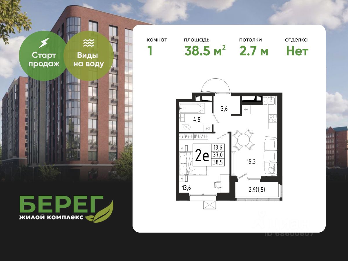 Продаётся 1-комнатная квартира в строящемся доме (Корпус 4 (2 очередь)), общей площадью 38.50 кв.м., на 8 этаже.